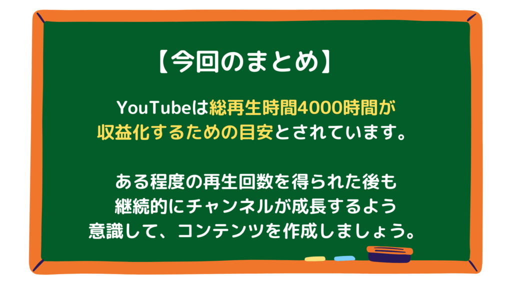 YouTubeで収益を得るための目安と言われる、総再生時間4000時間を超えるため、チャンネルを成長させ続けられるよう工夫を凝らしましょう。
