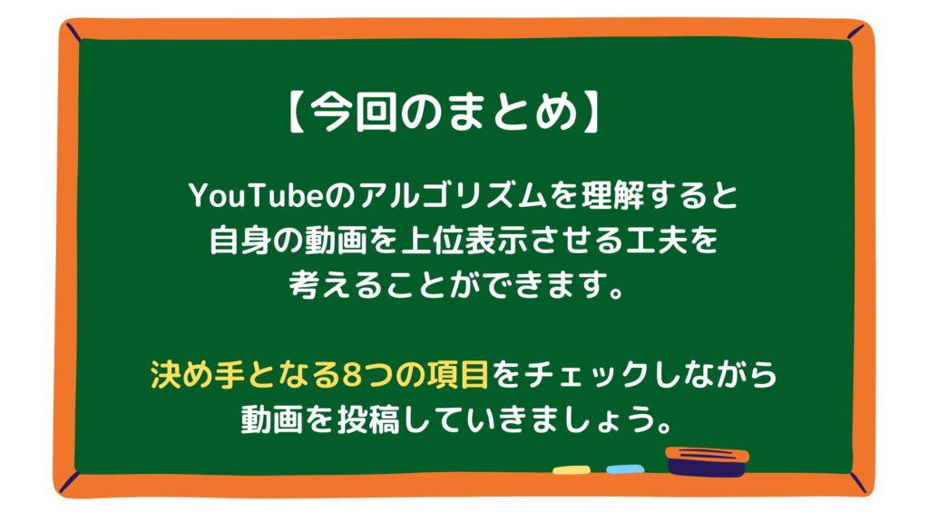 YouTubeのアルゴリズムでは、以下の8つの項目から動画に点数をつけ、検索結果上位に表示させたり、関連動画に表示させたりしています。